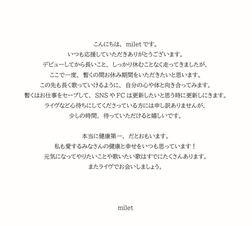 milet发文表示,自出道以来一直没有好好休息,「这次,我决定暂时休息一段时间。为了能够在未来长久地歌唱,我希望能重新审视自己的内心与身体。」除了减少工作量,社群媒体等看情况更新,「对于一直期待着演唱会等活动的大家,真的很抱歉,但如果你们能等我一下,我会很开心。」坦言健康真的很重要,「我还有很多想做的事情、想唱的歌,等我恢复元气,我们演唱会上再见吧。」